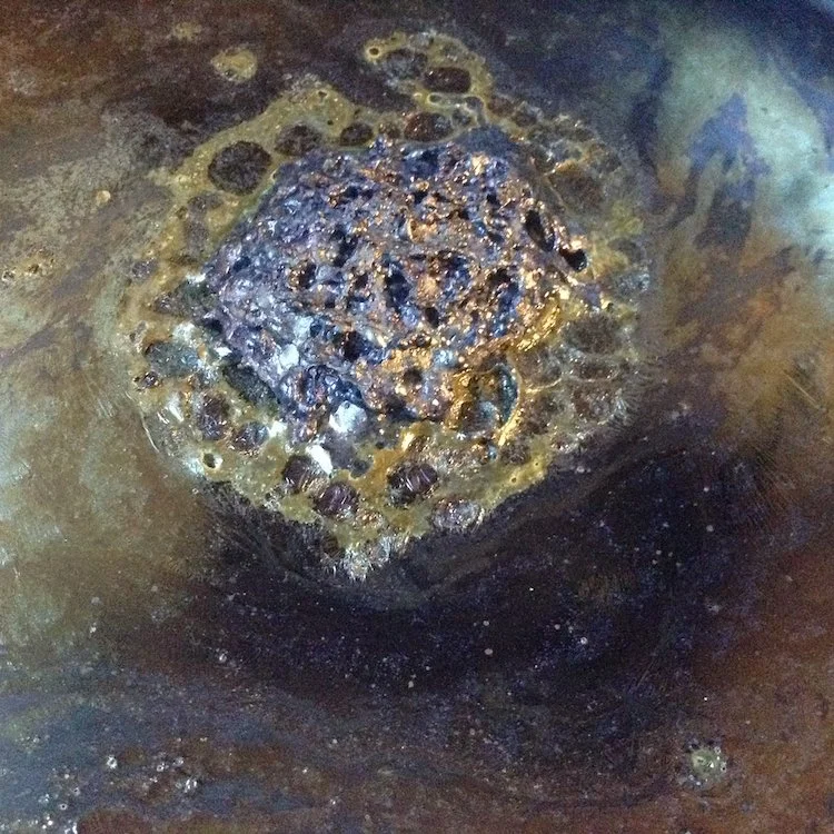 Beginnings of a copper sheen on the surface of a new indigo vat is a sign that things are starting to work