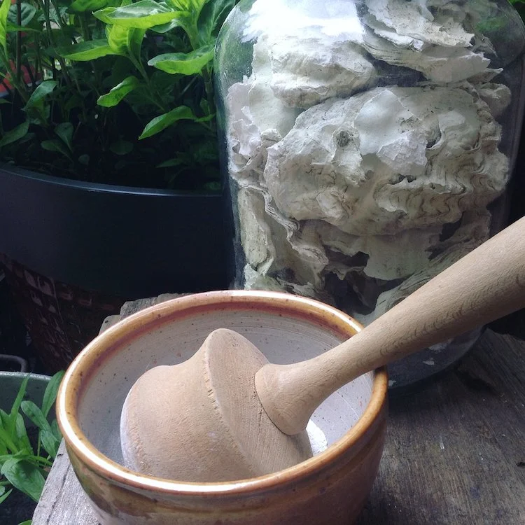 A friend, potter Richard Rowland, graciously cooked the oyster shells into lime for us using his kiln. During the firing the shells were placed inside a large unglazed pot Richard had made. The hard shells were rendered by the heat into a beautiful crumbly white texture. The transformed shells are easily crushed into powder using a mortar and pestle. By simply adding the powder to rain water, we were in the local lime business.