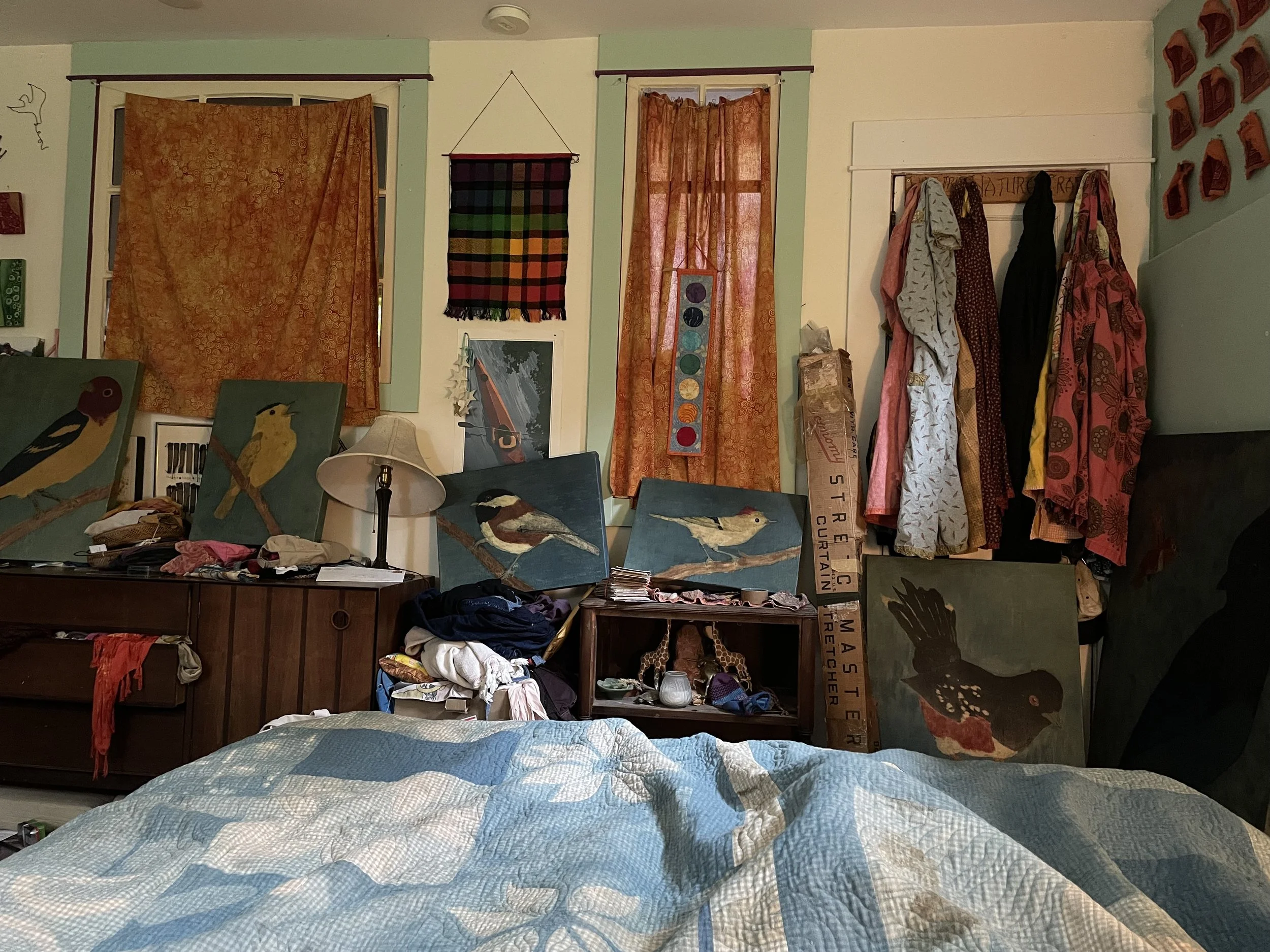 Last night I brought all the birds into the bedroom so I could wake up next to them. This isn’t the temple of pure white walls and perfect gallery lighting, and yet I am happy to see them here. It was the first good night’s sleep I have had in weeks. Today they will migrate south to be hung in an exhibition. They may never return to this place.