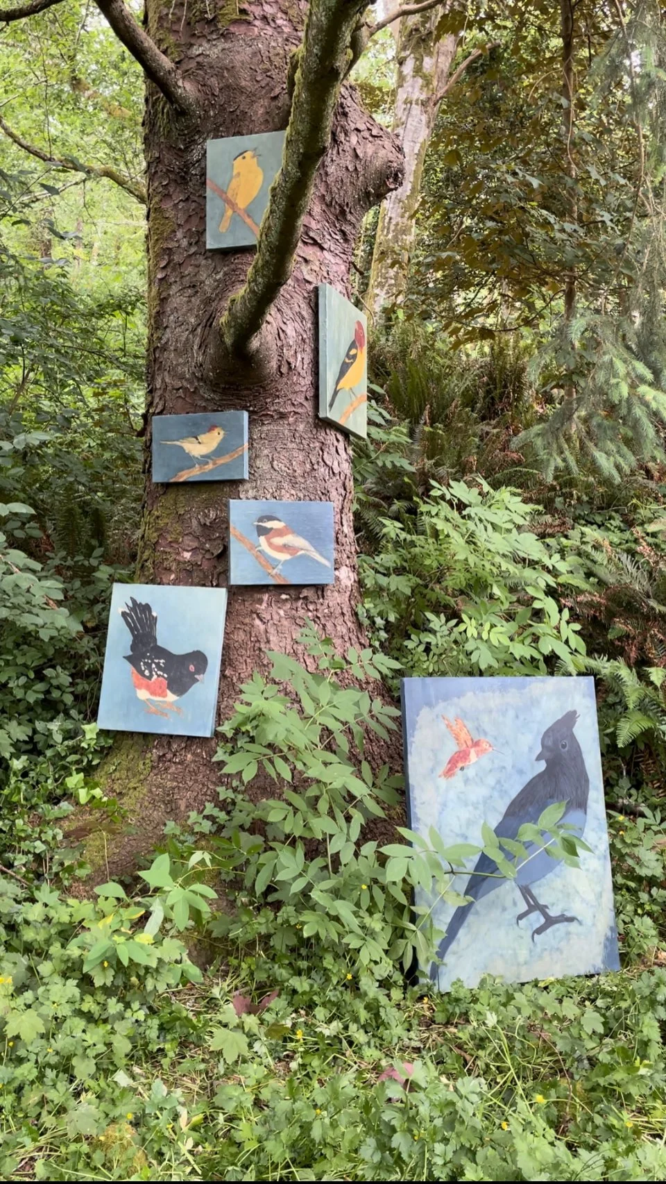 Birds in situ - spending time with the mother Sitka Spruce tree in the yard before migrating south to the Hoffman Gallery.